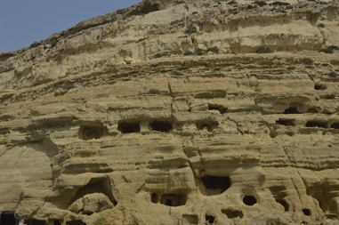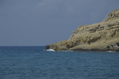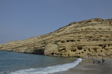 La Plage de Matala, et ses falaises aux habitations troglodytiques qui seront colonisées bien plus tard par des communautés hippies !.