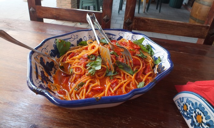 En redescendant le Vésuve, à la recherche d'une exploitation viticole pour acheter du Lacryma Christi nous tombons par hasard sur la Cantina de Vesuvio. Le concept : vous mangez quelques produits locaux en dégustant les différents crus de l'Azienda pour un prix dérisoire et vous pouvez visiter les chais et acheter leurs vins.