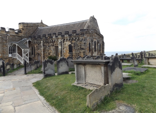 Le trés connu cimetière de l'Eglise Ste Mary de Whitby, inspiration de Bram Stoker pour son Dracula.
