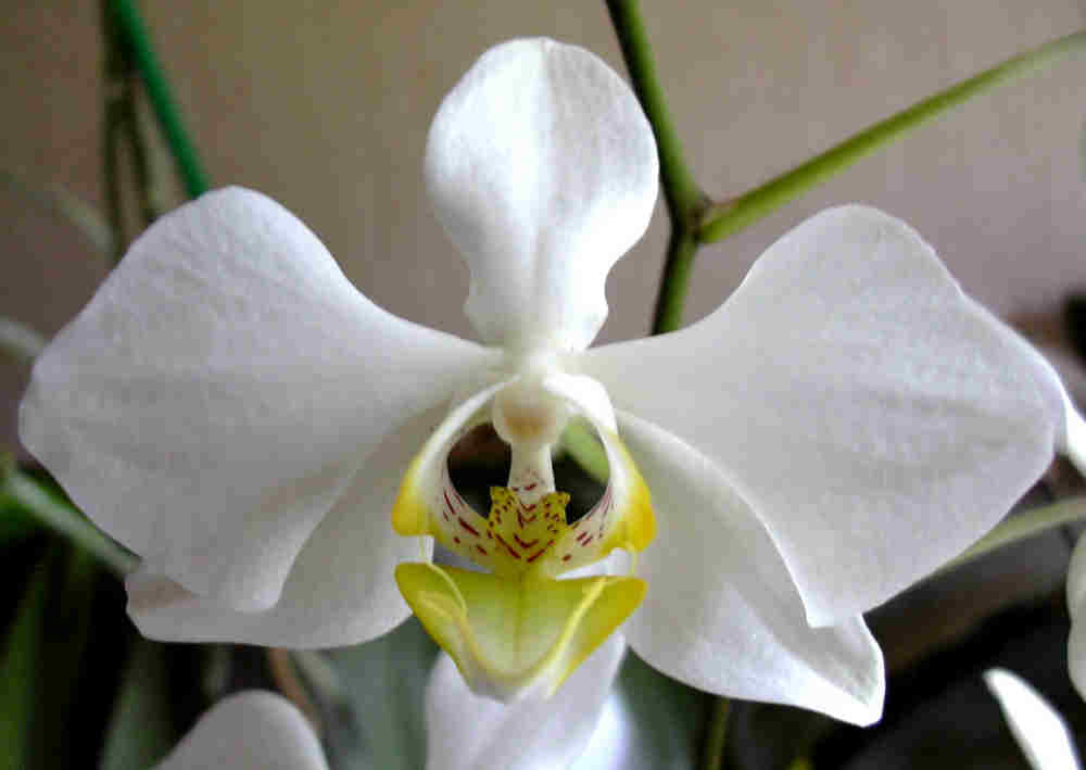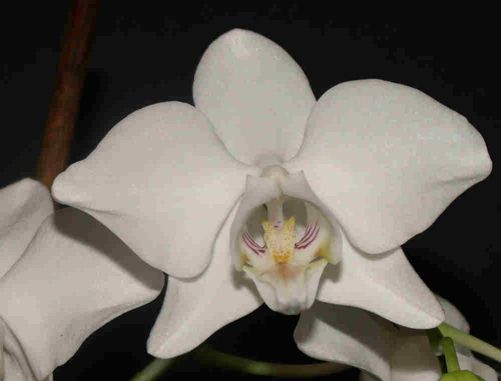 Plante de faible développement portant sur de courtes tiges, des fleurs rondes (2,5 cm) blanchâtres parcourues de stries rougeâtres, au cœur blanc et au labelle rouge plus foncé.